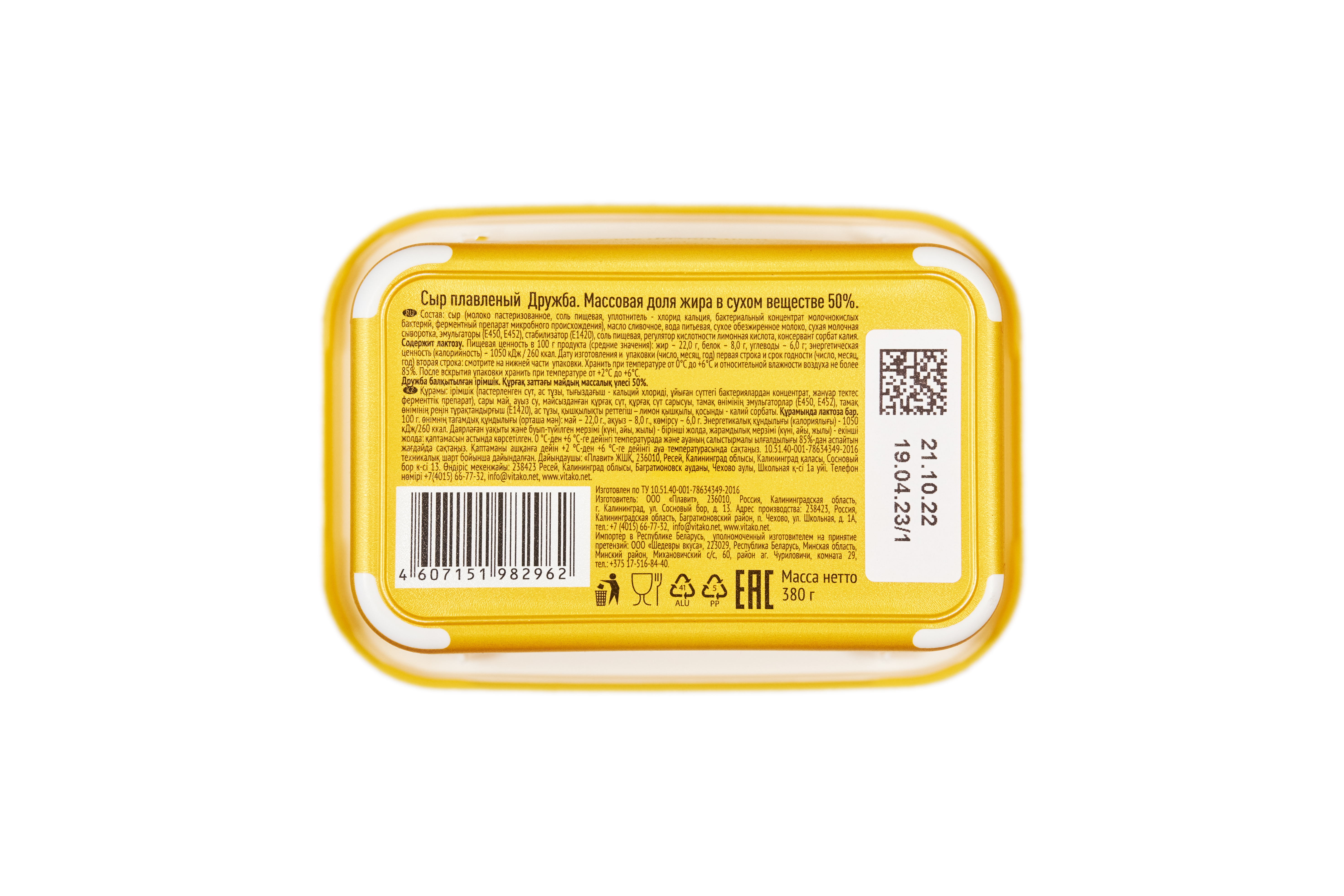 Дружба – это легендарный плавленый сыр, изготовленный из твердых сыров высокого качества. На протяжении многих лет плавленый сыр «ДРУЖБА» остается тем самым вкусом знакомым с детства. Плавленый сыр ВИТАКО делается только из качественных натуральных ингредиентов по современной технологии и уникальной рецептуре, именно поэтому он получается таким вкусным и сливочным. Порадуйте себя и своих близких вкусом любимого плавленого сыра в большом семейном формате упаковки.