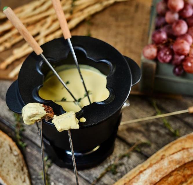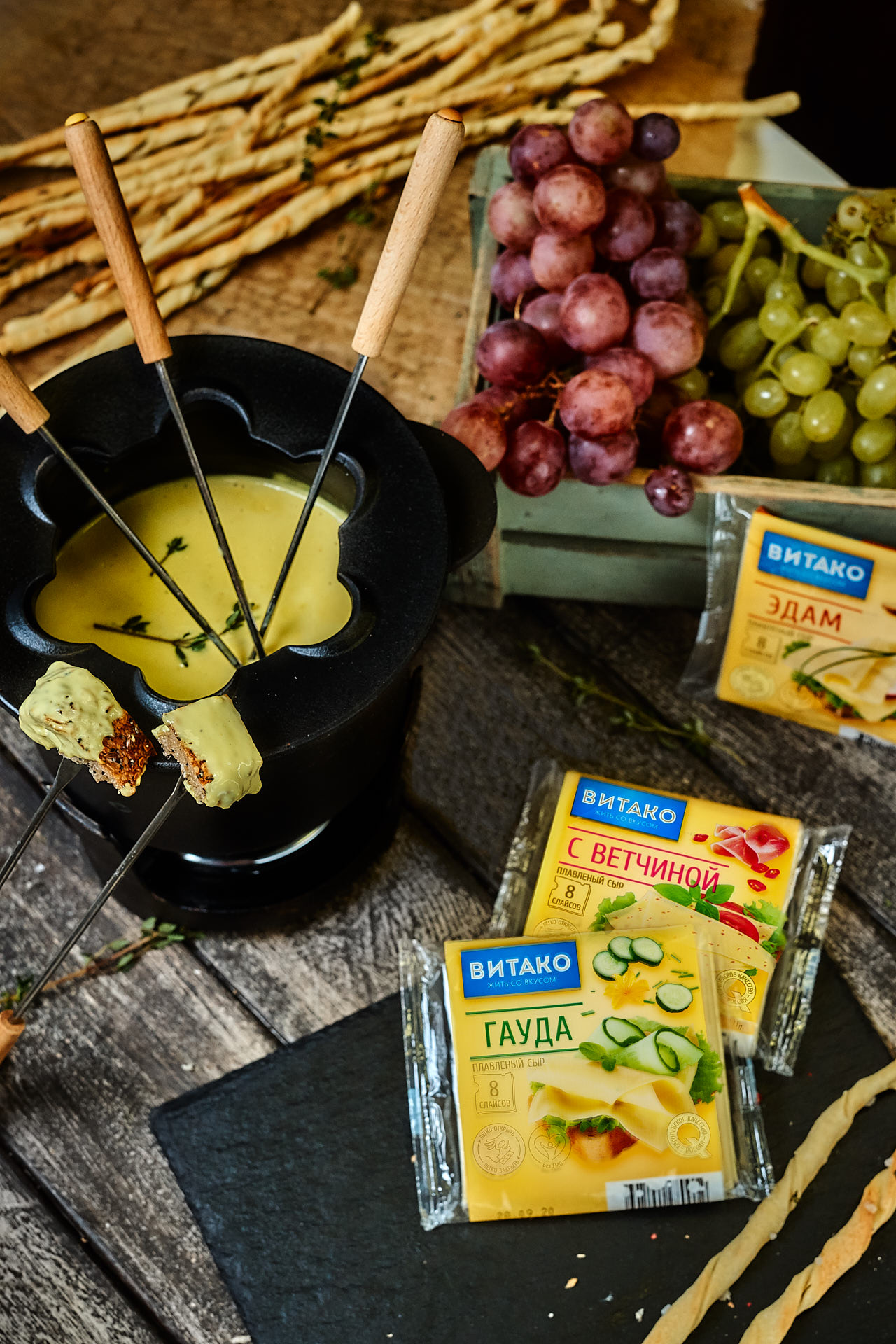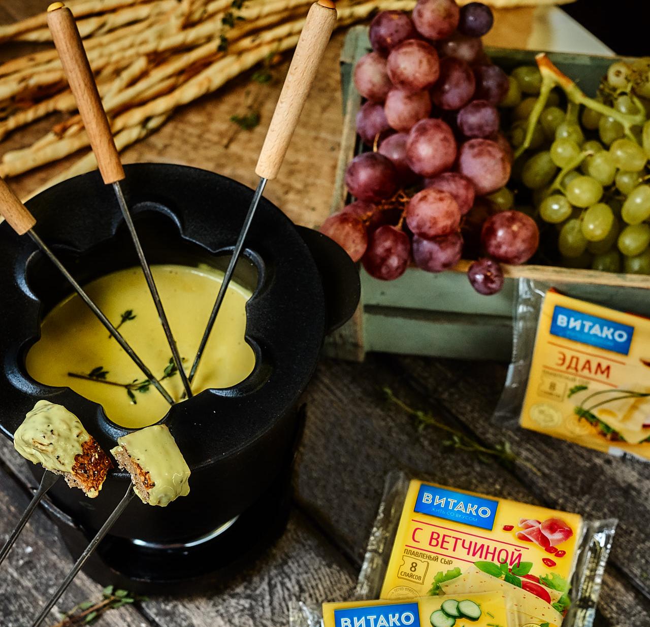 Поставьте сотейник на огонь и выложите в него плавленый сыр «Сливочный Витако», дождитесь, когда он начнет таять и, помешивая, влейте сливки до образования тягучей консистенции, добавьте мелко порубленный чеснок, вино, щепотку мускатного ореха, соль и перец по вкусу. Подержите на огне, дайте вину немного выпариться. Перелейте фондю в фондюшницу и поставьте в центр стола. Обмакивайте в фондю хлебные палочки Гриссини или кусочки багета, предварительно подсушенные в духовке.