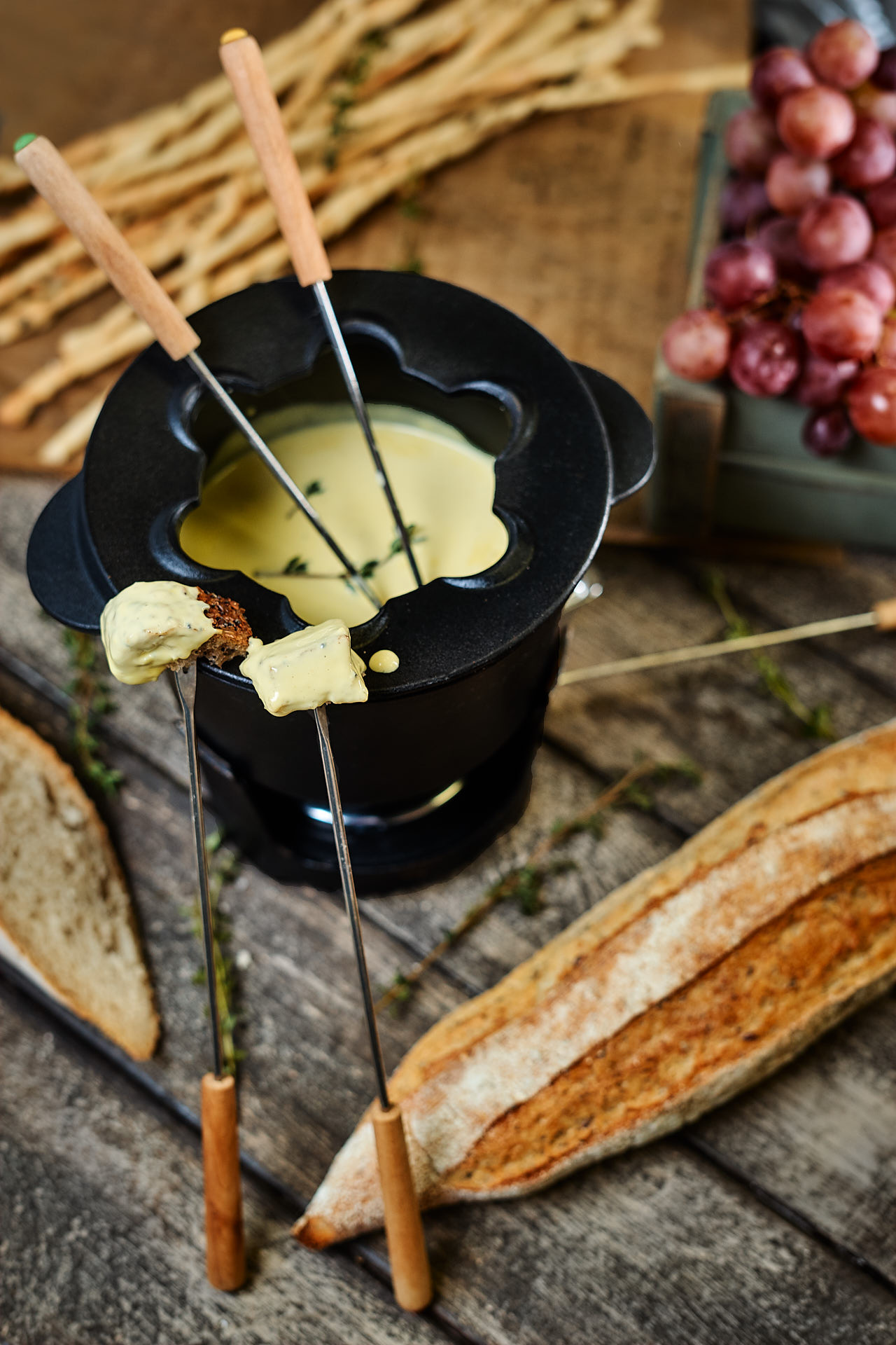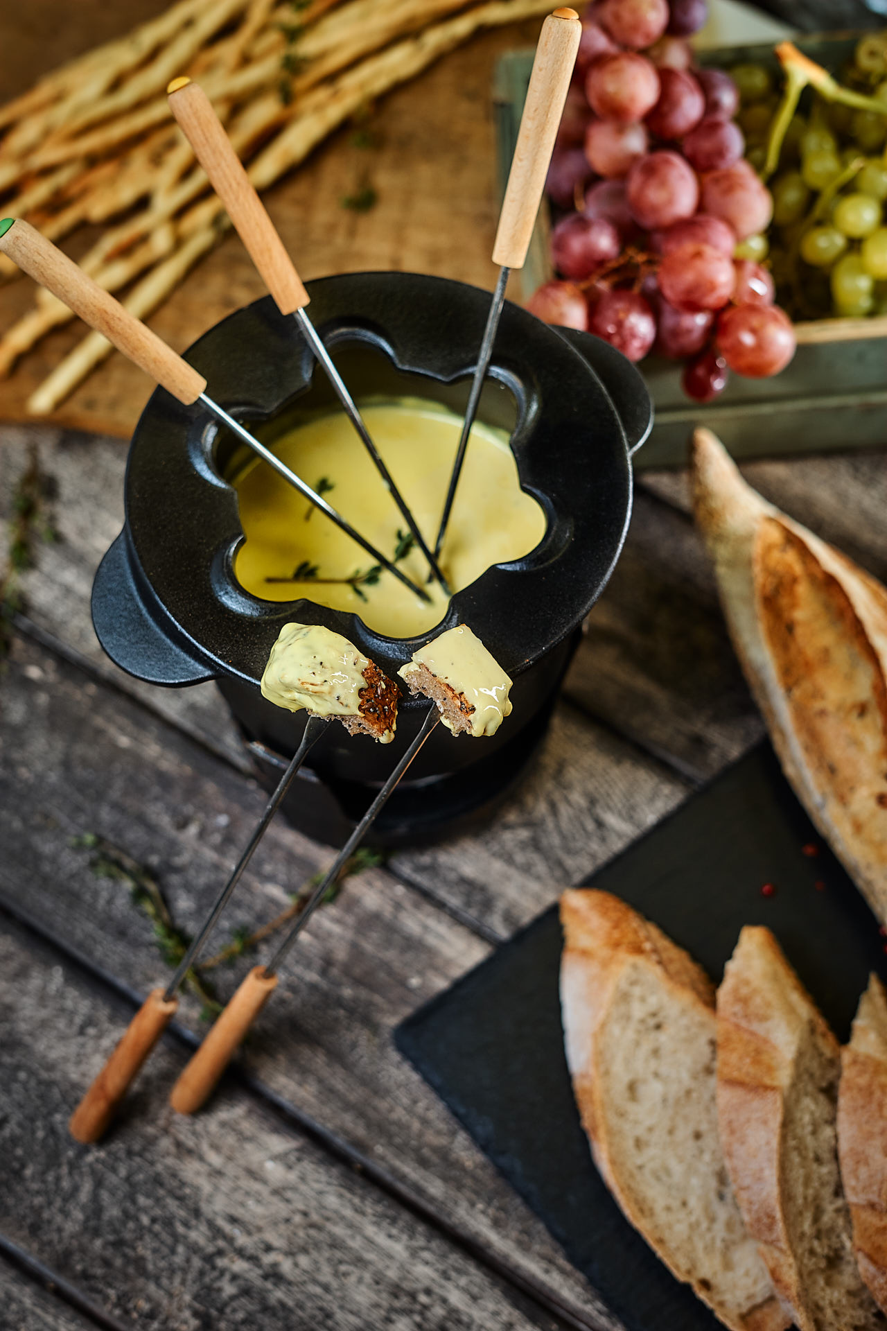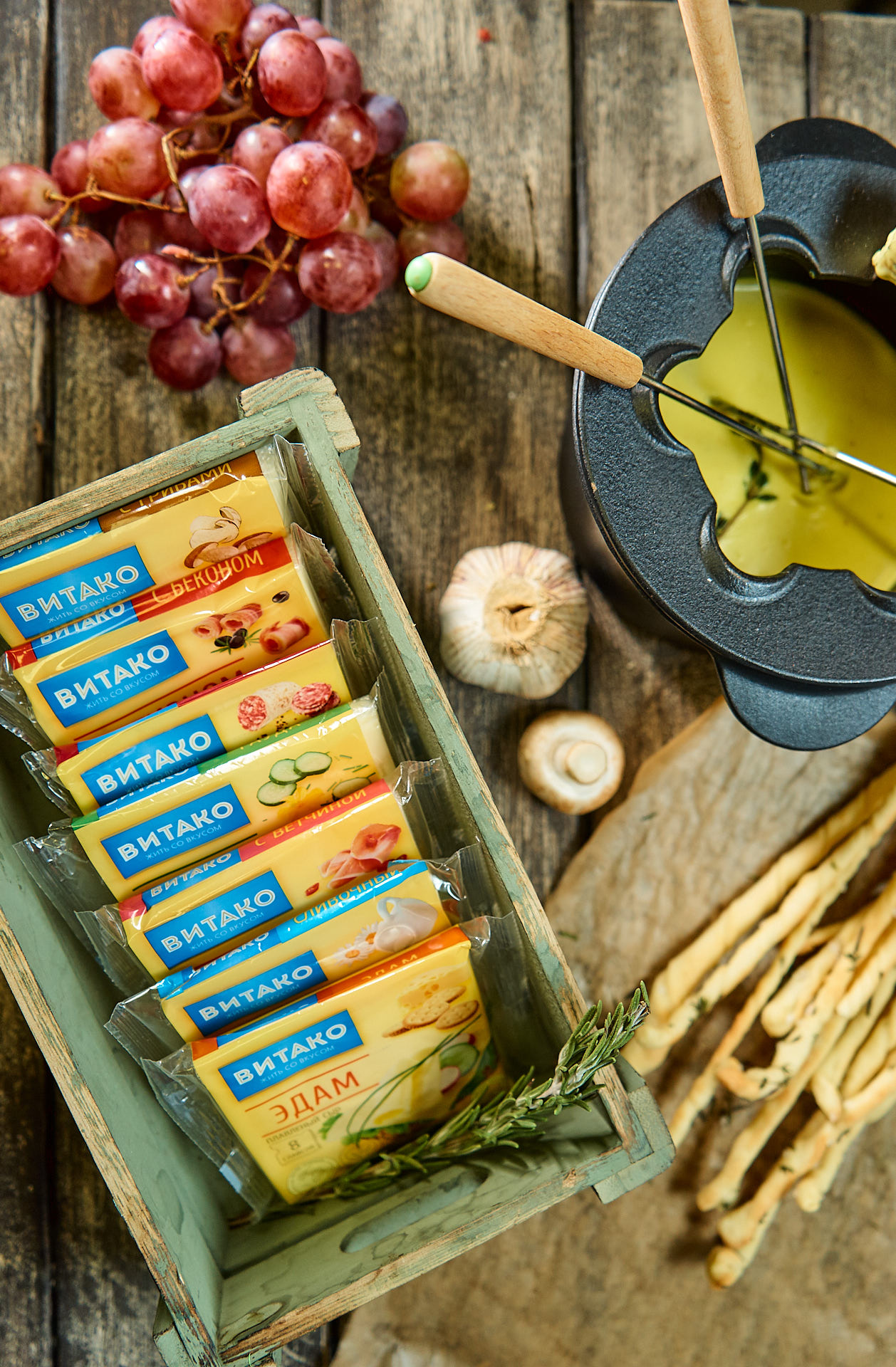 Поставьте сотейник на огонь и выложите в него плавленый сыр «Сливочный Витако», дождитесь, когда он начнет таять и, помешивая, влейте сливки до образования тягучей консистенции, добавьте мелко порубленный чеснок, вино, щепотку мускатного ореха, соль и перец по вкусу. Подержите на огне, дайте вину немного выпариться. Перелейте фондю в фондюшницу и поставьте в центр стола. Обмакивайте в фондю хлебные палочки Гриссини или кусочки багета, предварительно подсушенные в духовке.